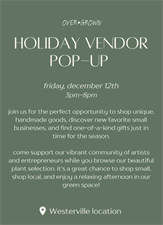 comes support our vibrant community of artists and entrepreneurs while you browse our beautiful plant selection. it's a great chance to shop small, shop local, and enjoy a relaxing afternoon in our green space!